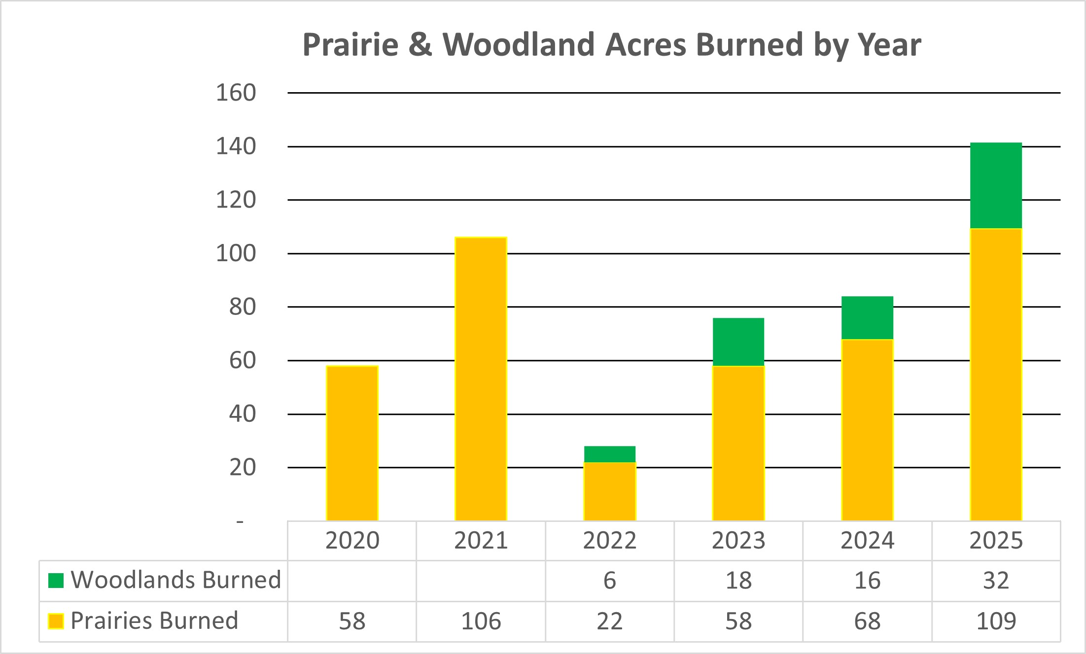 In the spring or fall, we work with the Property Manager on options for burning the prairies to remove thatch and promote new growth.  In 2015, this work stopped at our Park due to procedural changes that the State mandated.  In the fall & spring of 2020/21, with a grant and private donations, we burned 120 acres of prairie and they looked fantastic that summer after the burn.  Additional prairie (and woodland) burning is now happening each season as donations make this possible.